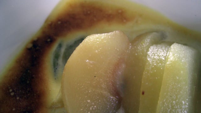 Mariage réussi entre la poire, la crème de cassis et un délicieux sabayon !