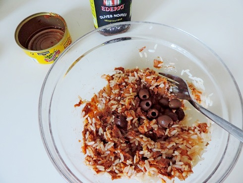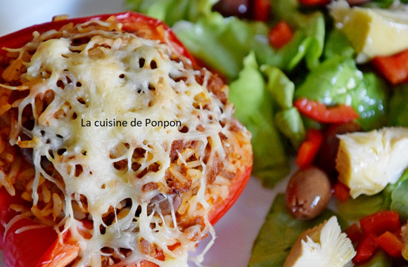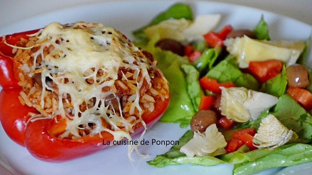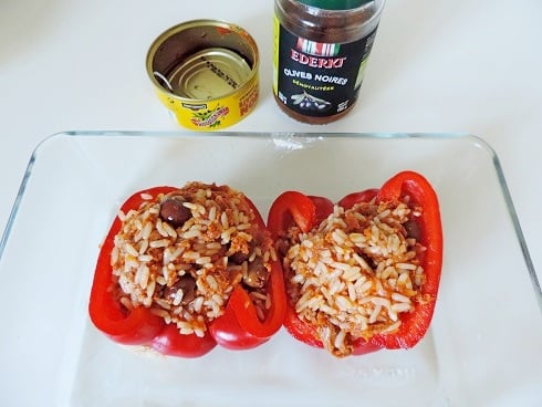 1Laver le poivron, couper le chapeau, l'épépiner et enlever les parties blanches. Couper le poivron en deux dans le sens de la longueur. Dans un bol, verser la boîte de thon, ajouter le riz cuit et quelques olives noires finement émincées, poivrer.
