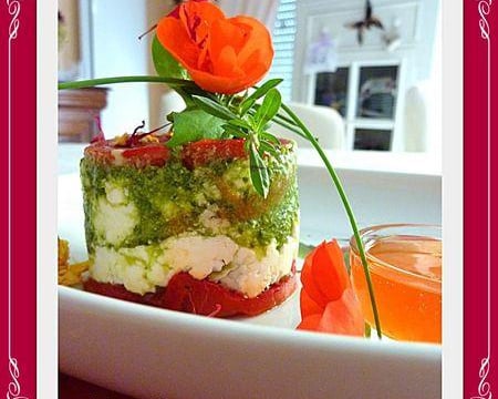 Nettoyez vos poivrons et coupez les en 2. Les mettre sur une plaque et enfournez à four chaud ( 180°) et cela pendant 40 minutes. Après ce temps les sortir et enlevez la peau. Découpez les poivrons avec les cercles en métal. Dans le cercle, faites une couche poivron, fromage salez le et poivrez le au préalable, une couche de pesto au basilic et une couche de pesto rosso puis recommencez pour terminer avec le poivron.