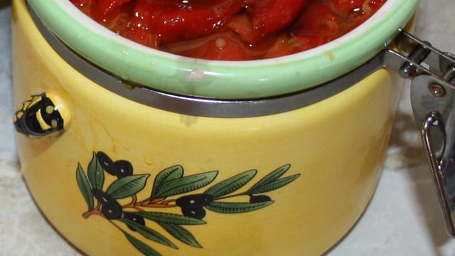 Dans un bocal a confiture par exemple mettre une couche de poivrons , de l'ail haché, et recouvrer d'huile d'olive . Salez. Renouveler l'étape jusqu'à plus de poivrons.