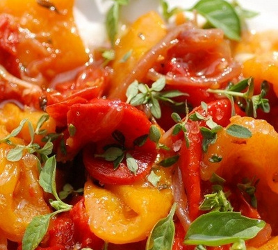 Il faut qu'à la fin les poivrons soient bien confits mais pas qu'ils soient entièrement défaits, à vous de cuire à votre goût. Quand c'est prêt, retirez du feu et saupoudrez des herbes restantes, salez si nécessaire. Servez avec de belles tranches de pain bien grillé sur lesquelles vous verserez un filet d'huile d'olive.