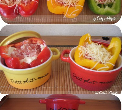 Lavez vos poivrons et coupez-les en deux, mettez dans un plat avec un leger fond d'eau, incorporez dans chaque poivron un fromage Kiri*, 1 cuillère à café de crème fraîche épaisse, des lardons allumettes et parsemez de gruyère râpé. Passez les four T° 180° pendant 40 min. Vous pouvez accompagnez ce plat de riz, où ce qu'il vous fait envie.