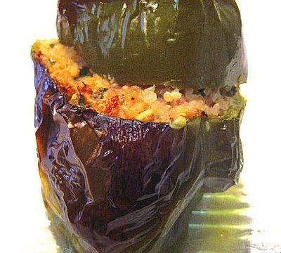 - Déposer les poivrons remplis de farce dans un plat allant au four, recouvrir avec leur chapeau et napper d'huile d'olive.