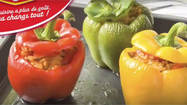 Salez, poivrez ou ajoutez du piment d'espelette sur les poivrons. Dans la farce, ajoutez la moutarde et mélangez. Ajoutez la farce dans les poivrons.