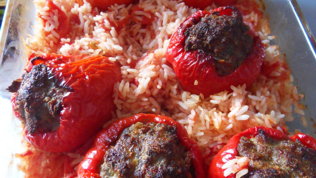 Lorsque l'on met les poivrons au four, on peut mettre de l'eau au fond du plat et ajouter du riz qui cuira dans le jus... Un régal !