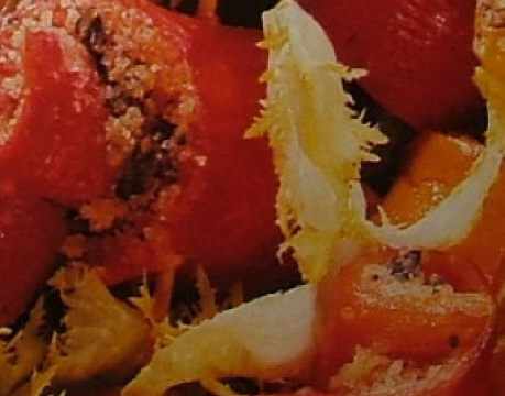 Garnir un plat de service de feuilles de frisées lavées et essorées et répartir dessus les petits rouleaux de poivrons farcis.