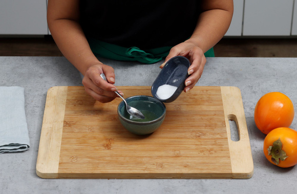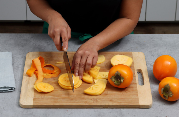 3Épluchez les Kakis Ribera del Xúquer AOP puis coupez-les en lamelles.