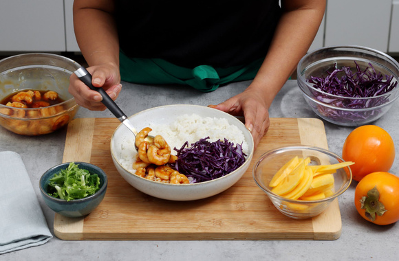 Ajoutez harmonieusement sur le dessus du riz le chou rouge râpé et les crevettes.