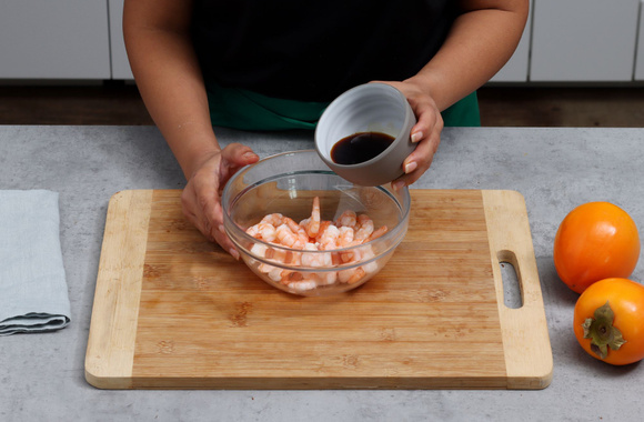 4Mettez les crevettes dans un bol et mélangez-les avec la sauce Teriyaki.