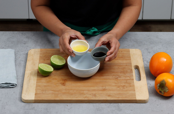 5Préparez la vinaigrette en versant dans un bol l'huile de sésame, la sauce soja, le jus de citron vert et le poivre.