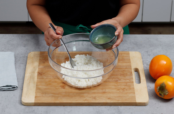 2Déposez le riz dans un saladier pour le refroidir. Versez la préparation vinaigrée sur le riz en plusieurs fois, en mélangeant délicatement pour ne pas écraser les grains. Laissez refroidir.