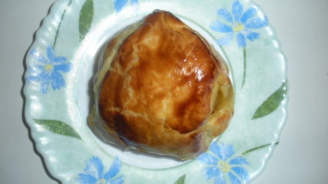Enfermer la pomme dans la pate feuilletée, bien coller les bords. badigeonner la pate avec du jaune d'oeuf