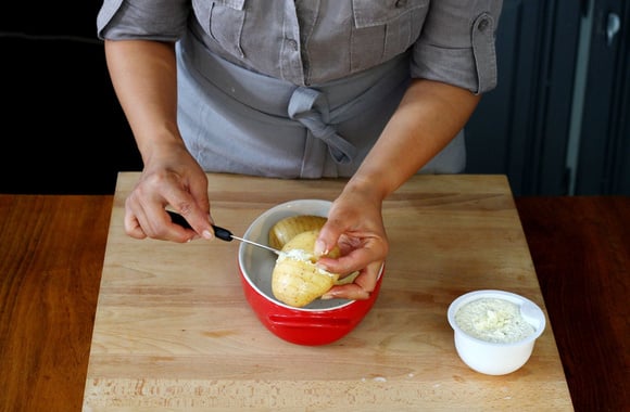 6A l'aide d'un couteau, garnissez les entailles des pommes de terre de Rondelé.