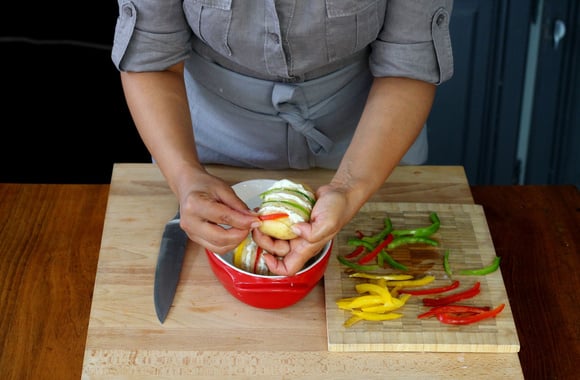 7Ajoutez les lanières de poivrons dans une entaille sur deux, en alternant les couleurs de poivron.