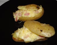 Les pommes de terre sont cuites au four, évidées puis regarnies avec une purée aux lardons et au fromage.