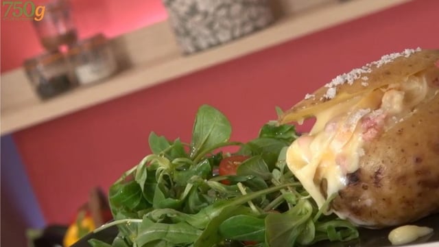 Mélangez le tout avec la chair de pomme de terre. Garnissez généreusement la pomme de terre creusée avec la préparation. Recouvrez-là d'une tranche de Reblochon puis du chapeau précédemment coupé.