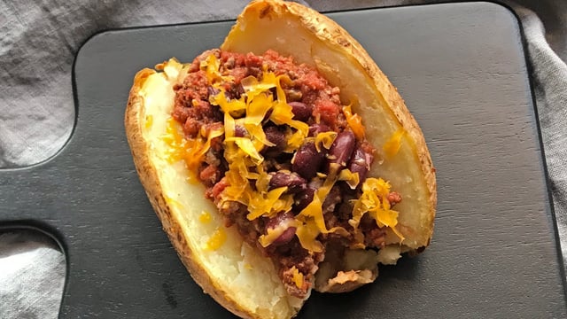 Quand les pommes de terre sont cuites, coupez-les en deux mais sans aller jusqu'au bout.