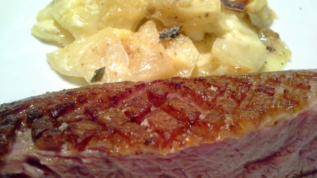 Strier la peau du magret, le cuire à feu vif 4 minutes côté graisse (enlever le surplus de graisse à la cuisson). Badigeonner le coté chair de moutarde et le cuire 4 minutes de l'autre côté. Couper le feu et le laisser reposer 10 minutes avec un papier d'alu.