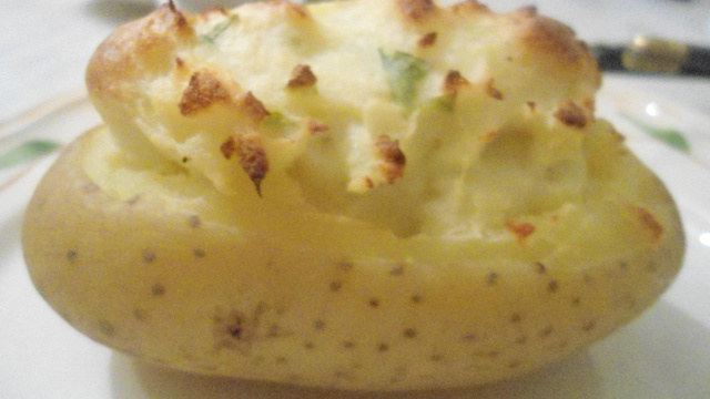 Évider délicatement les pommes de terre avec une petite cuillère, pour ne pas les casser. Écraser la chaire de pommes de terre à la fourchette, mélanger avec le fromage frais, le persil, l'échalote, le sel, le poivre et 2c à soupe de lait ou de crème fraîche. - 2