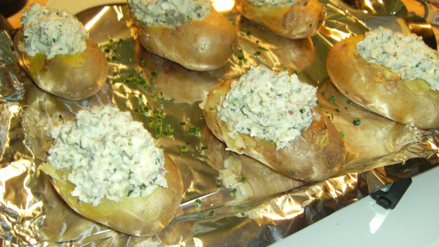 Lorsqu'elles sont cuites, sortez les pommes de terre du four, ôtez la feuille d'aluminium, à l'aide d'une cuillère creusez-les en prélevant un peu de chair.
