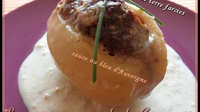 Creusez-les délicatement dans le sens de la longueur, tout en laissant un peu de chair. Remplir les pommes de terre avec la farce, les poser dans un plat allant au four, verser le vin blanc dans le plat avec 1/2 verre d'eau, recouvrir de papier aluminium et enfourner TH 200 °C pendant 35 min. Arroser de temps en temps avec le jus. Faire chauffer dans une casserole la crème fraîche, avec le bleu d'Auvergne puis mixer le tout.