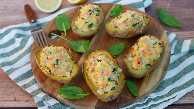 On craque complètement pour les pommes de terre farcies. Le principe est simple : on fait cuire des pommes de terre entières avec la peau, on récupère la chaire cuite que l'on mélange avec d'autres ingrédients. On ajoute cette garniture dans les pommes de terre et on fait une seconde cuisson très courte pour faire fondre le fromage. Cette version est relativement légère et permet de faire un repas complet.