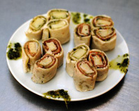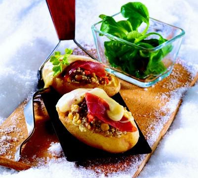Déposez sur le dessus de chacune des pommes de terre une tranche de jambon cru, ainsi qu'une tranche de fromage à raclette. Faites gratiner quelques minutes sous un grill.