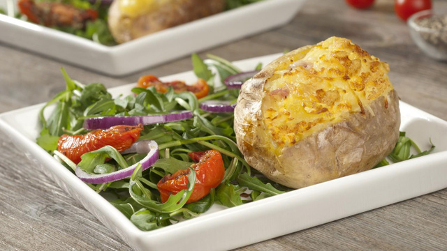 Cuire 4 grosses pommes de terre entières au four, puis les couper sur la longueur et les vider de moitié.