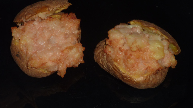 Remplir les pommes de terre évidées avec la farce. Remettre les petits chapeaux sur les pommes de terre. Poser vos pommes de terre sur la plaque du four et laissez les cuire et gratiner durant 10min.