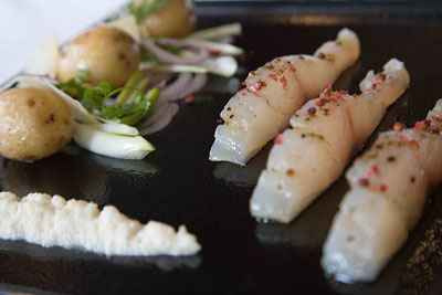Dans une assiette, disposer 6 tranches de daurade crue de façon régulière. Ajouter un peu de salade de pommes de terre aux herbes, puis parsemer quelques copeaux de vieux parmesan. Terminer par un trait de sauce au raifort, réalisée en mélangeant simplement tous les ingrédients.