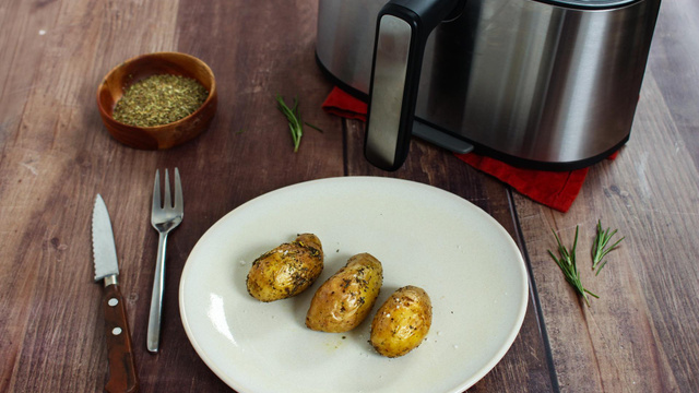 Disposez les pommes de terre sur la grille de l'Air Fryer avec la branche de romarin et faites cuire pendant 15 minutes, en remuant à mi-cuisson. Si besoin, prolongez la cuisson de quelques minutes jusqu’à ce qu'elles soient bien dorées.