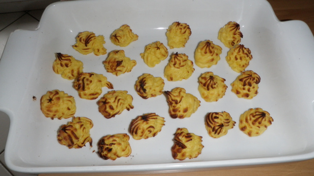 Losqu'elle sont cuites, les couper en deux, récupérez la pulpe avec une cuillère, puis écraser au moulin à légumes cette chair, incorporez 4 jaunes d'oeufs au kilo de pulpe, et le beurre fondu, assaisonnez. Mettre dans une poche à douille cannelée, et vous pouvez formez des choux, des puits, (dans lequel vous pouvez y déposer une autre garniture) et passez au four pour réchauffer, elles coloreront légérement et ferons le régal des petits mais aussi des grands....