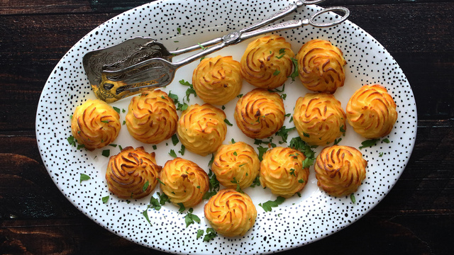 Avec leur jolie forme, les pommes duchesse se repèrent à des kilomètres à la ronde. En plus, c'est un régal et c'est plutôt facile à faire. Durant un repas de Noël ou de Nouvel An, ces pommes duchesse tombent à pic pour accompagner vos plats. Pour bien les réussir, choisissez en priorité des pommes de terre farineuses de type bintje. Commencez par les faire cuire à l'anglaise : dans de l'eau froide puis dans de l'eau chaude. Ensuite, retirez la peau de pommes de terre et passez-les au presse-purée pour avoir une texture épaisse, mais pas élastique. Dans un saladier, mélangez cette purée avec un jaune d'œuf ainsi que du beurre. Insérez le tout dans une poche à douille et choisissez un gros embout cannelé et formez des pommes duchesse. Espacez les pommes duchesse sur une plaque de cuisson avec du papier sulfurisé et enfournez pour un quart d'heure. Moelleuses, vos pommes duchesse accompagneront à merveille vos viandes grillées ou vos volailles rôties.