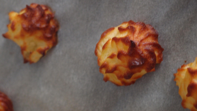 Pour le façonnage, j'ai décidé de le faire à la douille cannelée d'assez gros diamètre... Attention de bien avoir un mélange sans morceau car sinon votre douille se bloque. Sur une plaque à pâtisserie recouverte d'un papier sulfurisé collé aux 4 bords avec un peu de l'appareil, pocher des pommes duchesses de tailles uniformes.