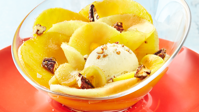 div>Disposer les morceaux de fruits rôtis dans une assiette à dessert avec une boule de glace à la vanille, le tout saupoudré de noix caramélisées.