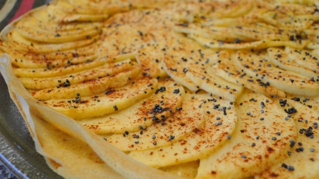 Disposer les lamelles de pommes, puis saupoudrer de sucre, de cannelle et de graines de pavot.