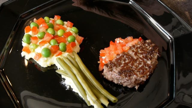 Puis on pose dessous ½ steak faisant office de panier avec de la purée recouverte de tomates.