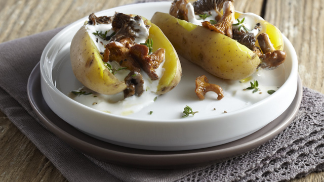 Dans une assiette, présenter les Pompadour Label Rouge ouvertes en deux, recouvertes de champignons. Napper de sauce coco et disposer des pluches de Coriandre.