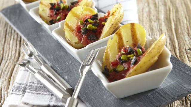 Cuire à l'eau bouillante salée les Pompadour Label Rouga ; les éplucher et les passer sous le grill chaud.