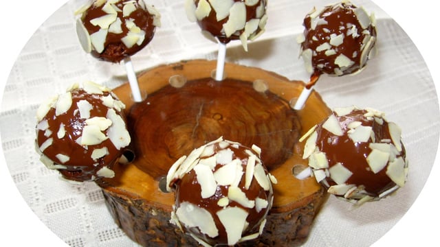 De petites sucettes de biscuit au chocolat entourant une bille de pâte d'amande.