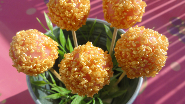Ajoutez du colorant alimentaire en poudre rose et mélanger. Trempez le bout du pique dans le chocolat et le planter dans la boule de pâte. Remettre au réfrigérateur pendant 15 minutes. Trempez ensuite la boule entière dans le chocolat. Laissez sécher et décorer avec du sucre doré.