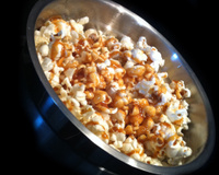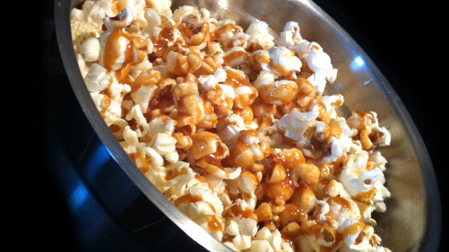 Enfin dans la casserole (encore pleine de résidus de beurre) placer le sucre (sans ajouter d'eau), avec une pincée de sel, et laisser fondre doucement jusqu'à obtention d'un caramel bien fluide, que vous verserez sur le popcorn en le mélangeant !