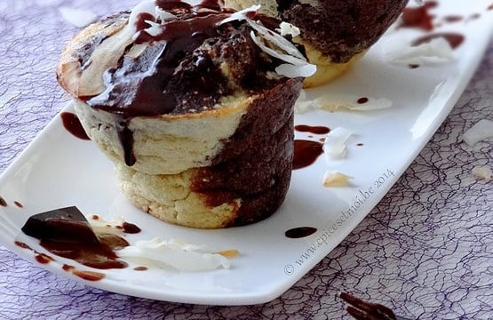 Verser en alternant la pâte coco et la pâte cacao dans les moules à muffins chauds.