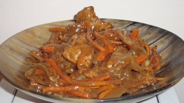Coupez la viande en petites lanières. Pelez les carottes et coupez les en fins bâtonnets, pelez et émincez les oignons et l'ail.