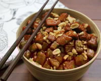 Servez le porc sur des bols de riz, parsemez de cacahuètes concassées et servez.