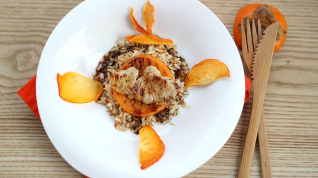 Couper le Kaki en tranches un peu épaisses (1/2cm) et les pôeler. Dresser les assiettes en mettant le riz, la tranche de kaki Persimon poêlée, le porc aux agrumes. Arroser de 2 cuillères à soupe de sauce. Disposer quelques chips de kaki si vous les avez préparez. Bon appétit avec le kaki !