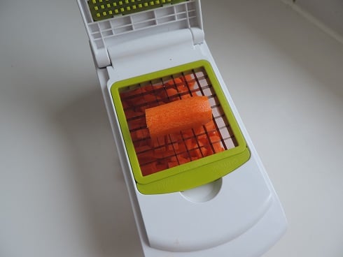 1Laver les carottes, les peler et les couper en cubes grâce à la mandoline. Réserver.