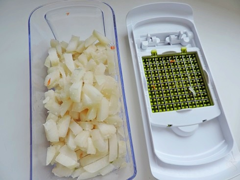 2Laver les navets, les peler et les couper en cubes grâce à la mandoline. Réserver. Peler et émincer les oignons. Réserver. Laver et émincer les blancs de poireaux. Réserver. Couper la viande en dés et réserver.