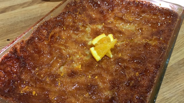 Pendant la cuisson du gâteau, réaliser le sirop : faire chauffer dans une casserole 40 cl d’eau avec les 150g de sucre restants et le jus des 4 oranges. Porter à ébullition et laisser chauffer 10 min.