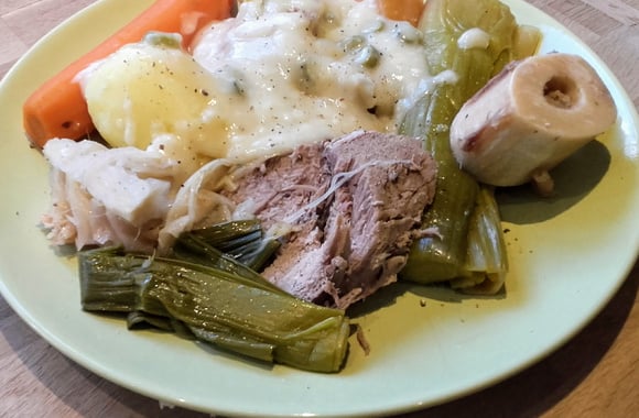 Je vous propose aujourd'hui la recette d'un plat traditionnel de la cuisine Française, le pot-au-feu certes un grand classique pour nos périodes hivernales, mais tellement bon. Il sera composé de viande de bœuf bouillie, d'os à moelle, de carottes, de poireaux, de pommes de terre, de navets jaunes, de chou vert qui vont cuire ensemble afin d'en dégager toutes ses saveurs. je vous propose de le servir avec une sauce blanche réalisée avec le bouillon de cuisson dans lequel seront ajoutés quelques cornichons taillés en lamelles. Ce plat est un véritable régal ... Ah j'allais oublier, pour le soir filtrer le bouillon de cuisson du pot-au-feu ajoutez des vermicelles et votre soupe est prête.
